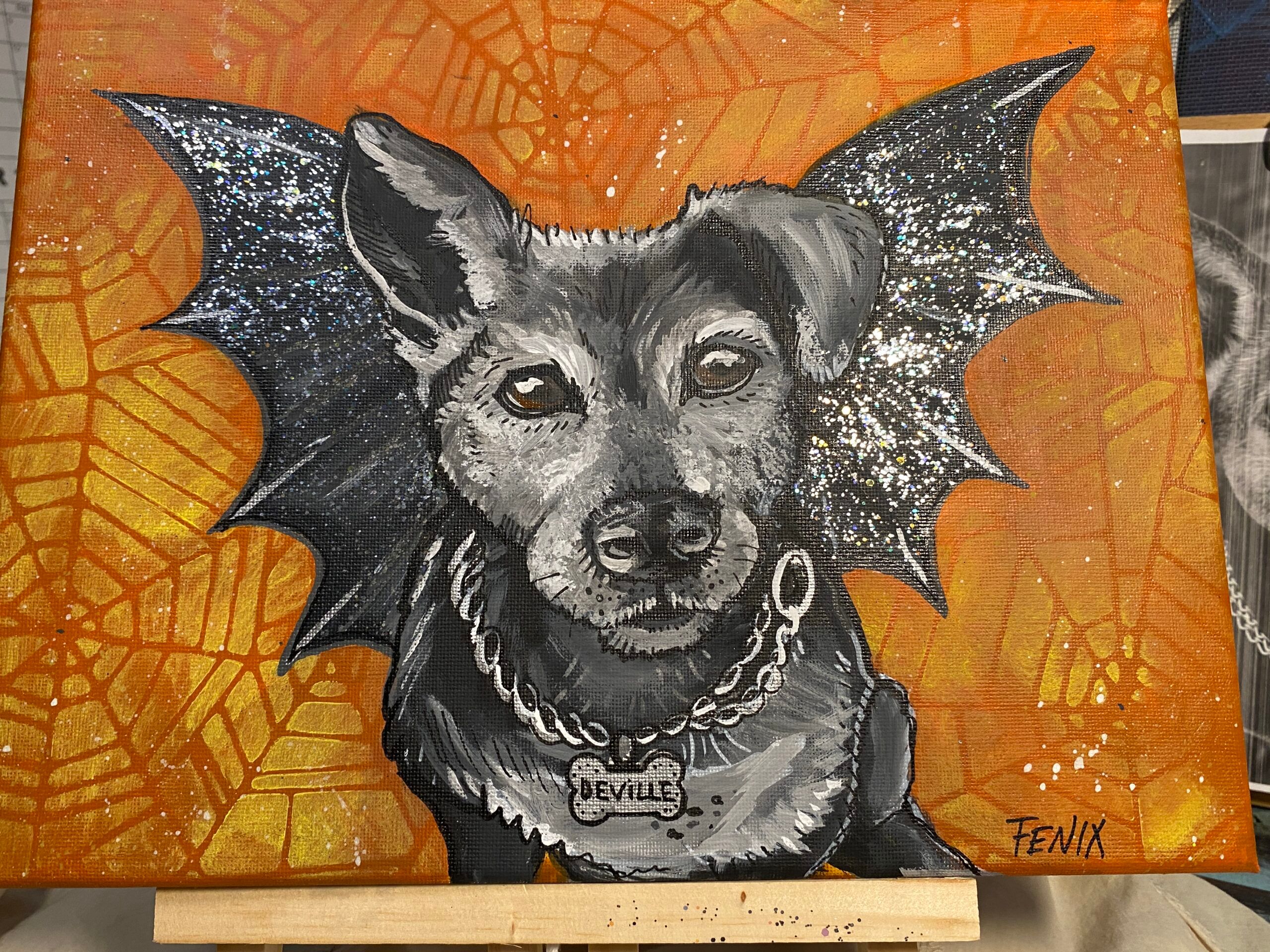 Provided: A 9”x12” canvas with your pet pre outlined with devil horns/tail, or bat wings. Or a Halloween picture of your choice. Acrylic paints, acrylic paint pens, & expert instructions. Advanced RSVP and payment required.